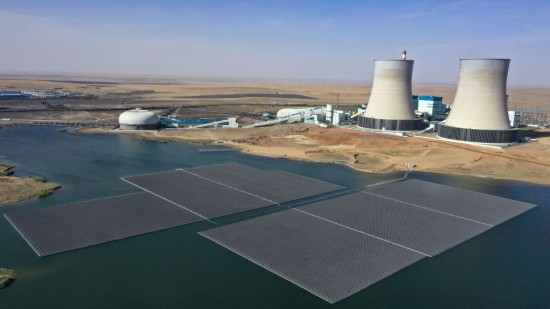 國(guó)家能源集團(tuán)寧夏電力公司寧東電廠3×5.98兆瓦漂浮分布式光伏發(fā)電項(xiàng)目全景(無(wú)人機(jī)照片,2022年6月17日攝)。新華社記者 王鵬 攝