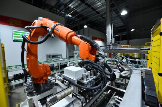 在廣西柳州市一家新能源汽車(chē)電池生產(chǎn)企業(yè),機(jī)器人在生產(chǎn)線上作業(yè)(2023年5月10日攝)。新華社記者 黃孝邦 攝