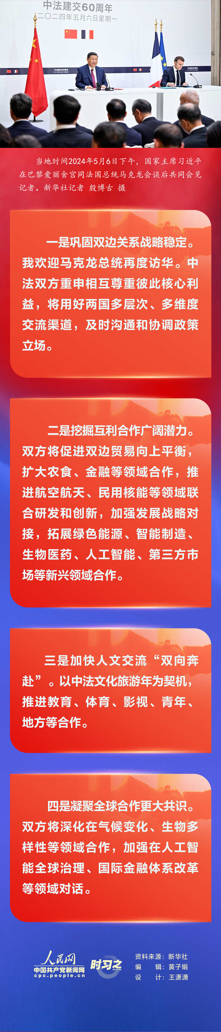 當(dāng)?shù)貢r間2024年5月6日下午,國家主席習(xí)近平在巴黎愛麗舍宮同法國總統(tǒng)馬克龍會談后共同會見記者。習(xí)近平指出,很高興應(yīng)馬克龍總統(tǒng)邀請,在中法建交60周年之際,再次對法國進行國事訪問。我同馬克龍總統(tǒng)舉行了富有成果的會談。我們一致認為,中法關(guān)系具有珍貴歷史、獨特價值和重要使命,雙方要傳好歷史的接力棒,弘揚中法建交精神并為其賦予新的時代內(nèi)涵,開啟中法關(guān)系下一個60年的新征程。