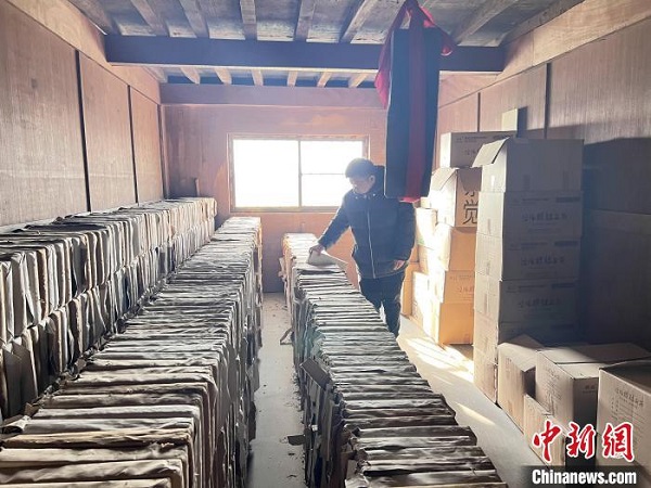圖為賈振翻轉(zhuǎn)陳化中的茶磚。李一璠攝