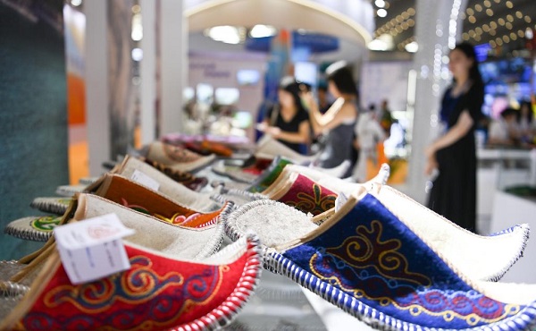 8月17日,參觀者在交流合作館吉爾吉斯斯坦展區(qū)了解特色商品。新華社記者 鄒競一 攝