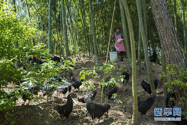 村民在喂食竹林烏骨雞(2017年4月攝)。新華社發(fā)