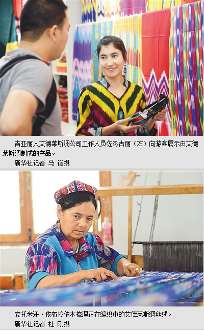 時過立秋,居住在新疆維吾爾自治區(qū)和田市吉亞鄉(xiāng)的安托米汗·依布拉依木早早來到位于該鄉(xiāng)的吉亞麗人艾德萊斯綢公司車間,用有千年歷史的艾德萊斯綢織就“脫貧橋”。近年來,新疆大力發(fā)展紡織服裝、民族傳統(tǒng)手工藝等勞動密集型產(chǎn)業(yè),幫助農(nóng)村富余勞動力就地就近就業(yè)。在吉亞鄉(xiāng),政府不僅利用各方資金免費給村民發(fā)放艾德萊斯綢織機,還組織已具規(guī)模的專業(yè)大戶培訓貧困戶子女,帶動其脫貧致富的同時也為這項古老技藝注入新鮮血液。