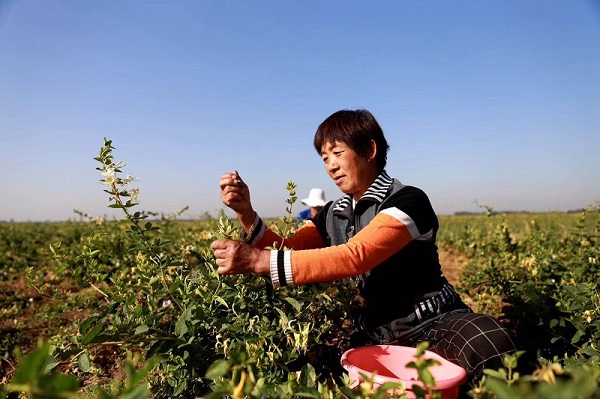 六月的渭南,熱情似火。在陜西省渭南市臨渭區(qū)藺店鎮(zhèn)紅花店村的田間地頭到處洋溢著豐收的喜悅,全村500畝金銀花競(jìng)相開(kāi)放。村民們顧不得擦掉臉上的汗水,笑容滿面地采摘著第一年豐收的金銀花。