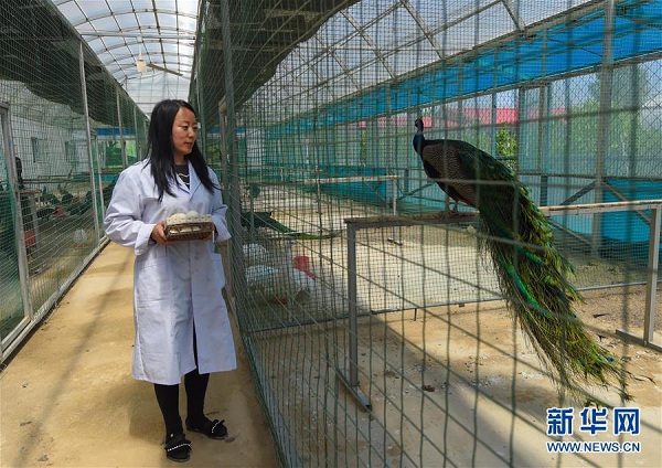 周海南在內(nèi)蒙古興安盟烏蘭浩特市義勒力特鎮(zhèn)蒙雀養(yǎng)殖專業(yè)合作社照料孔雀。養(yǎng)殖孔雀帶動貧困戶脫貧致富(2018年5月21日攝)。新華社記者 彭源 攝