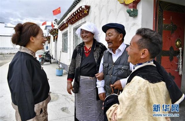 彩渠塘村婦女主任宜西措姆(左一)與村致富帶頭人贊瓊(右一)一家交流(8月2日攝)。近年來,西藏自治區(qū)多措并舉,實施易地扶貧搬遷,解決“一方水土養(yǎng)不起一方人”的發(fā)展困境,使搬遷戶實現(xiàn)穩(wěn)定脫貧、安置區(qū)加快發(fā)展,為鄉(xiāng)村振興奠定了堅實基礎。西藏拉薩市當雄縣羊八井鎮(zhèn)彩渠塘村的150戶683名村民是2017年底開始陸續(xù)從那曲、阿里、昌都等地區(qū)極為艱苦的地帶搬遷而來的。村民原來大多在高寒地區(qū)隨牧而居、沒水沒電、缺醫(yī)少藥。來到新村后,不僅衣食住行和醫(yī)療都有了保障,還靠羊八井地熱溫泉旅游入股分紅,發(fā)展綿羊育肥、手工加工合作社等集體經(jīng)濟和就近就便務工增加收入,村民們過上了幸福的小康生活。新華社記者 張汝鋒 攝