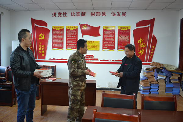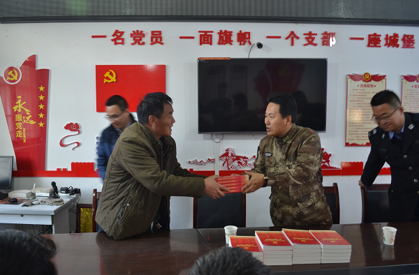 (人武部黨委書記張林孝向草碧鎮(zhèn)邢家塬村、上店村黨員同志贈送《學習輔導百問》)