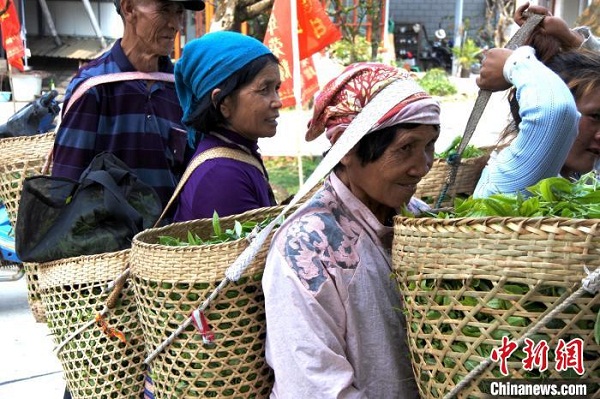 圖為賀開村村民將成筐的春茶鮮葉售賣到當?shù)夭杵蟆?羅婕 攝