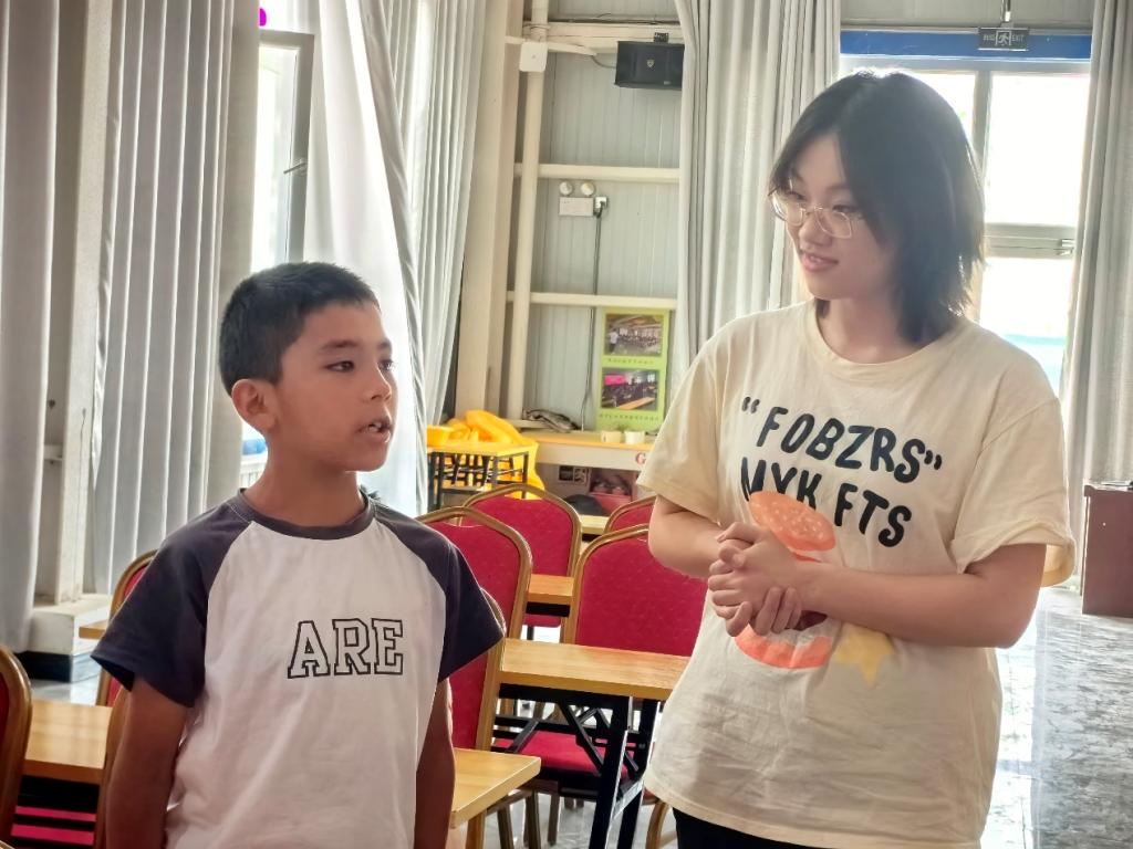 授課前,團隊深入當(dāng)?shù)鼐用褡纣惙茓I·買買提、卡迪爾丹·托乎尼牙孜等家中走訪調(diào)研,了解村民漢語實際掌握情況,為實踐活動奠定基礎(chǔ)。授課中,團隊采取集體講授、分組訓(xùn)練、單獨輔導(dǎo)和學(xué)員展示等多種形式循序漸進展開培訓(xùn),就朗誦技巧中的“情景再現(xiàn)”“內(nèi)在語”“對象感”“停連節(jié)奏”“重音語氣”等進行了賞析式、沉浸式解讀;精選了多部優(yōu)秀作品,包括詩歌、散文、故事等,根據(jù)學(xué)員年齡、文化水平、語言表達實際情況等分組進行訓(xùn)練;對重難點學(xué)員逐一單獨輔導(dǎo)。整個過程中,學(xué)員們積極配合,熱情參與,最后的展示環(huán)節(jié)聲情并茂地演繹了一首首中華經(jīng)典作品,《我愛這土地》讀出了對祖國無限的熱愛,《柯柯牙頌》飽含著對老一輩人艱苦奮斗精神的贊美和家鄉(xiāng)日新月異變化的驚喜,《青春中國》更是層次鮮明的歌頌了青年們?yōu)榱诵轮袊啻簾o悔的奉獻精神。學(xué)習(xí)之余,唱歌、跳舞、做游戲等豐富多彩的活動極大地拉近了彼此之間的距離,進一步鑄牢中華民族共同體意識。