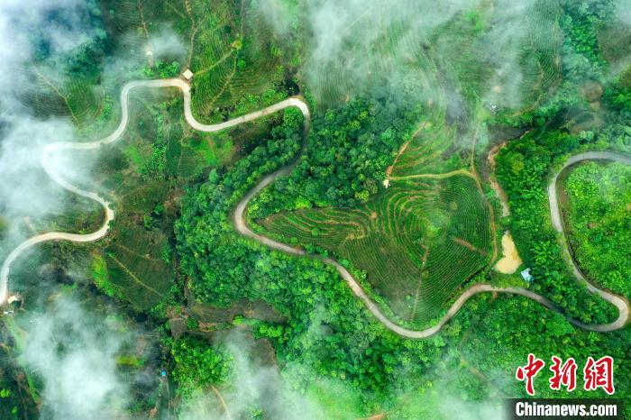 六堡鎮(zhèn)長(zhǎng)群山生態(tài)茶園,山間云霧繚繞,茶樹郁郁蔥蔥(資料圖)。潘紹珊攝