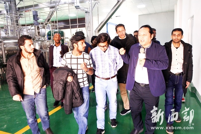 劉翔教授(右二)向留學(xué)生們介紹北極宮4G茯茶生產(chǎn)線