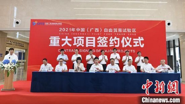 中新網(wǎng)南寧7月18日電 (記者 林浩)7月18日,2021年中國(guó)(廣西)自由貿(mào)易試驗(yàn)區(qū)(以下簡(jiǎn)稱廣西自貿(mào)試驗(yàn)區(qū))重大項(xiàng)目簽約儀式在南寧市舉行,共簽約重大項(xiàng)目17個(gè),含1個(gè)戰(zhàn)略合作協(xié)議,16個(gè)產(chǎn)業(yè)項(xiàng)目;簽約項(xiàng)目總投資額131億元人民幣。