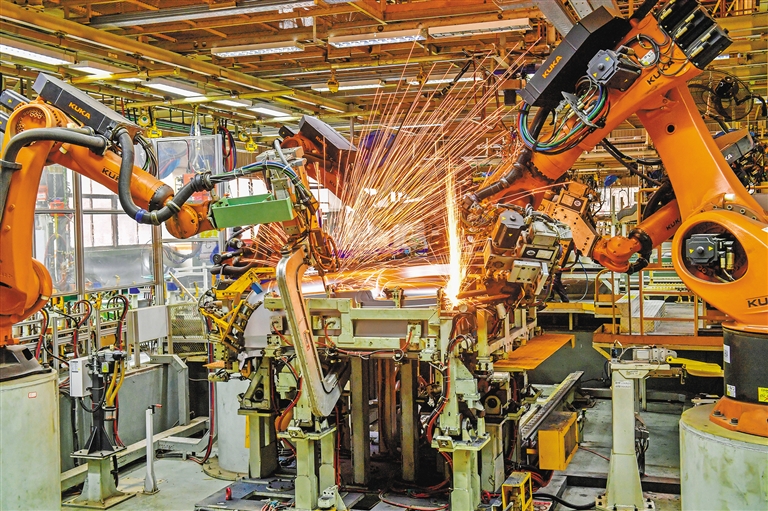 ▲12月15日,在陜汽西安商用車產(chǎn)業(yè)園車身廠,工業(yè)機(jī)器人在焊接作業(yè)。