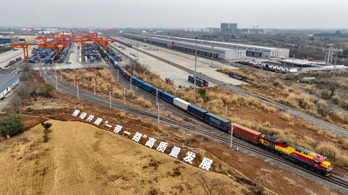 2024年3月8日,一列滿載電子產(chǎn)品的中歐班列從成都國(guó)際鐵路港駛出。(成都市青白江區(qū)融媒體中心供圖)