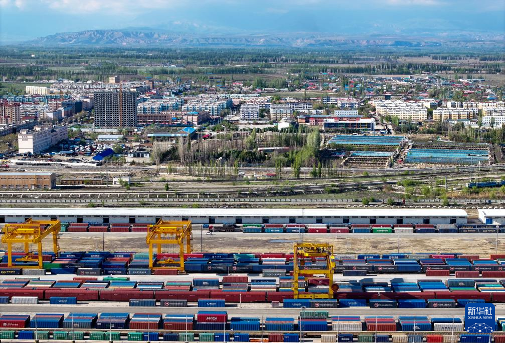 在新疆烏魯木齊國際陸港區(qū),集裝箱裝卸作業(yè)有序進(jìn)行(2024年5月27日攝)。新華社記者 王菲 攝