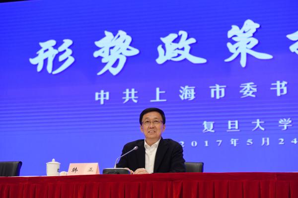 上海市委書記韓正今天下午來到復(fù)旦大學(xué),為師生們作形勢政策報告。