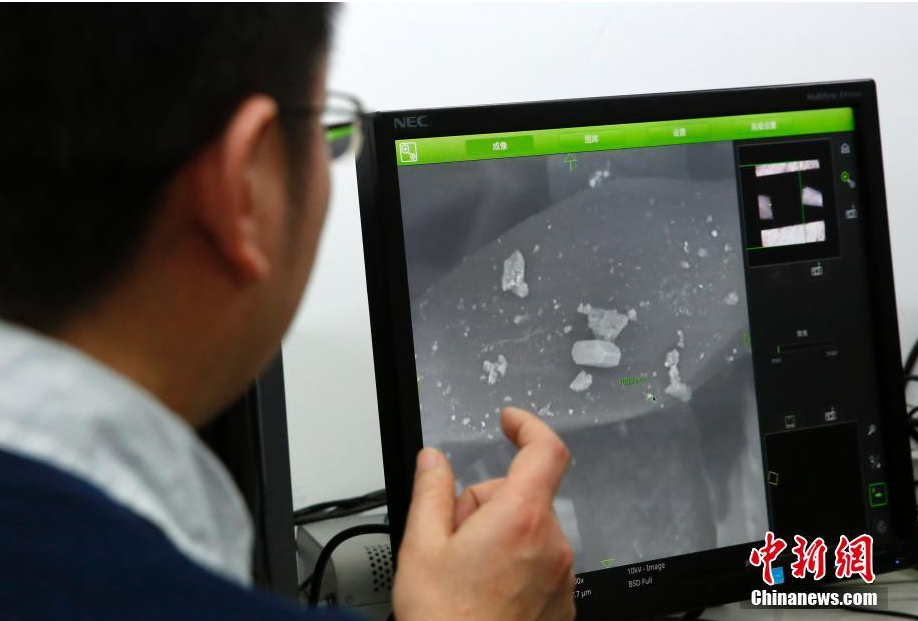 1月3日,北京化工大學(xué)高分子納米復(fù)合材料實(shí)驗(yàn)室劉勇教授通過(guò)臺(tái)式掃描電子顯微鏡,觀察近期使用后的防霾鼻罩濾芯上采集的霧霾顆粒,以及分析霧霾顆粒里面含有的各種元素。近日,北京持續(xù)霧霾天氣。圖為防霾鼻罩濾芯上采集的霧霾顆粒。中新社記者 韓海丹 攝