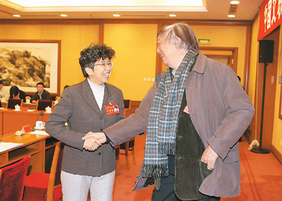 在第十次全國文代會召開前夕,中國文聯(lián)黨組書記、副主席趙實(左)11月29日到駐地看望與會代表。