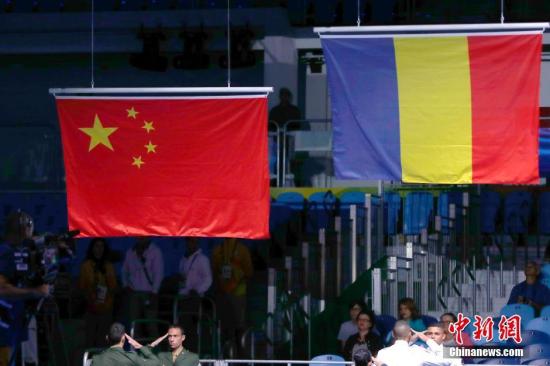 當(dāng)?shù)貢r(shí)間8月11日,在2016年里約奧運(yùn)會(huì)女子重劍團(tuán)體賽決賽中,中國(guó)隊(duì)以38比44不敵羅馬尼亞隊(duì),獲得銀牌。在賽后的頒獎(jiǎng)儀式中,賽事組委會(huì)升起正確的五星紅旗。中新網(wǎng)記者 富田 攝