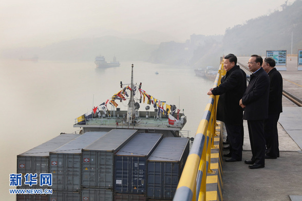 2016年1月4日至6日,中共中央總書記、國家主席、中央軍委主席習近平在重慶調研。這是1月4日下午,習近平在重慶兩江新區(qū)果園港碼頭視察長江航運和港口裝卸作業(yè)。新華社記者蘭紅光攝