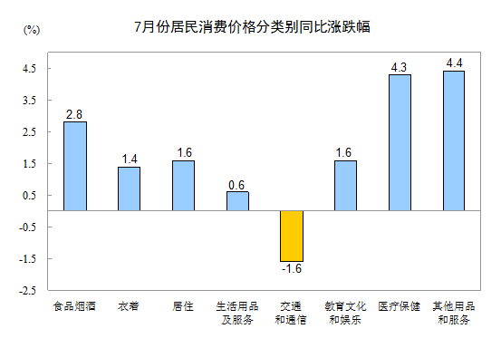 7月份,其他七大類價格同比六漲一降。其中,其他用品和服務(wù)、醫(yī)療保健、居住、教育文化和娛樂、衣著、生活用品及服務(wù)價格分別上漲4.4%、4.3%、1.6%、1.6%、1.4%、0.6%;交通和通信價格下降1.6%。
