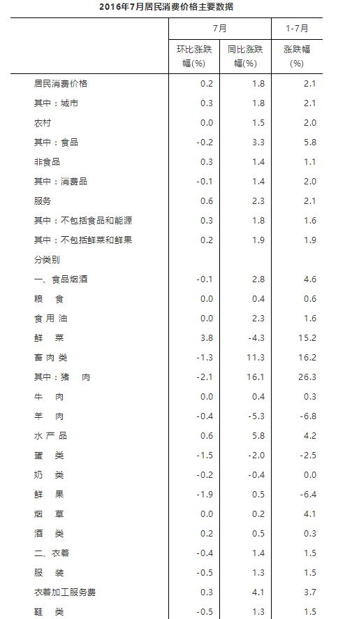 據(jù)國家統(tǒng)計局網(wǎng)站消息,2016年7月份,全國居民消費價格總水平同比上漲1.8%。其中,城市上漲1.8%,農(nóng)村上漲1.5%;食品價格上漲3.3%,非食品價格上漲1.4%;消費品價格上漲1.4%,服務(wù)價格上漲2.3%。