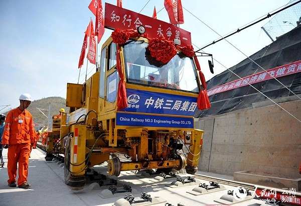 4月28日10時18分,位于云南省昆明市呈貢區(qū)的滬昆高鐵云南段大新冊大橋與黃連山二號隧道接軌點彩旗飛揚,中鐵三局鋪軌機牽引的最后一組長500米、分別重30噸的長鋼軌在接軌點落地后,施工人員迅速擰緊長鋼軌的扣件螺栓,這標志著滬昆高鐵云南段全線鋪通,云南將邁入高鐵時代,以“四縱四橫”為主骨架的中國高鐵網(wǎng)也將全部投入運營。