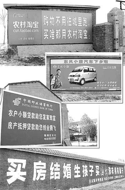 ?以前是“百年大計,教育為本”的教育刷墻,后來是“某某創(chuàng)造,最好豬料”的農(nóng)資刷墻,再到如今,汽車、電子產(chǎn)品、快速消費品、商品房等新鮮物件都紛紛出現(xiàn)在農(nóng)村的墻體廣告上。