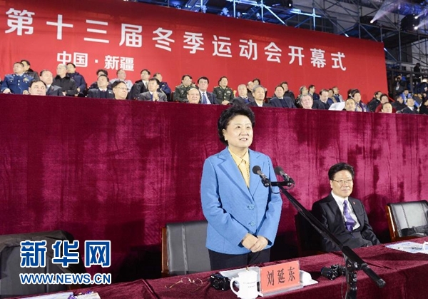 ????出席開幕式期間,劉延東、張春賢等視察了相關設施,觀看了比賽,會見了運動員、教練員、裁判員、志愿者、安保和媒體人員代表,并向大家致以新春的祝福。劉延東指出,本屆冬運會是我國獲得2022年冬奧會舉辦權之后的第一個全國冰雪盛會,是“十三五”開局之年的第一個全國運動會,也是首次走出東北在西部邊疆民族地區(qū)舉辦的冬運會,對于發(fā)展冰雪運動、打造健康中國、全面建成小康社會具有重要意義。她感謝自治區(qū)黨委、人民政府及全區(qū)各族人民為舉辦冬運會提供的良好條件。她希望參賽運動員弘揚中華體育精神,發(fā)揮競技水平,取得運動成績和精神文明雙豐收,為2022年冬奧會錘煉技術、積累經驗。她勉勵大家做冰雪文化傳播者、示范者,引導廣大群眾特別是青少年踴躍參與,為帶動3億人參與冰雪運動、推動全民健身作出應有貢獻。她要求各有關方面按照綠色、共享、開放、廉潔辦賽理念,精心組織,扎實工作,舉辦一屆精彩、成功、歡樂、平安、節(jié)儉的冬運會。