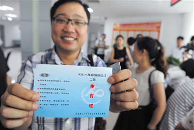 2014年6月17日,河南鄭州市金水區(qū)行政辦事大廳,孫先生領(lǐng)到了單獨(dú)二孩生育證。圖/CFP