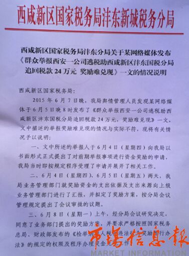 日前,有媒體報道稱“陜西寧陜縣黃某因舉報一企業(yè)逃稅助稅務(wù)局追回24萬稅款,獎勵難兌現(xiàn)”。市場信息報記者走訪了解到,黃某舉報一企業(yè)逃稅助西咸新區(qū)國家稅務(wù)局灃東分局追回24萬稅款一事屬實。國稅灃東分局回應(yīng),舉報人按程序遞交書面獎勵申請后,經(jīng)上級部門審核批準(zhǔn),將在一周內(nèi)按國家相關(guān)政策發(fā)放獎金,不存在獎勵難兌現(xiàn)的問題。
