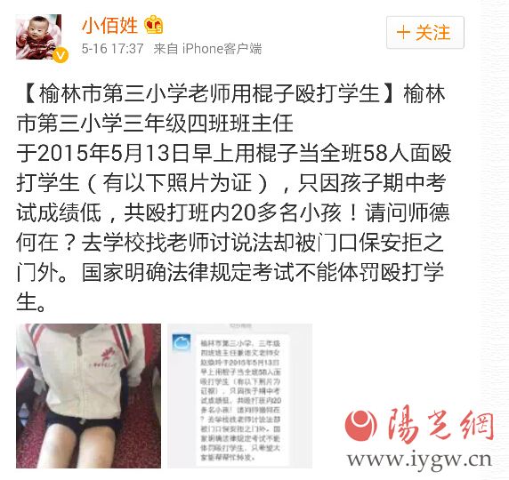 微博內(nèi)容反映稱:榆林市第三小學(xué)三年級四班班主任于2015年5月13日早上用棍子當(dāng)全班58人面毆打?qū)W生(有照片為證),只因孩子期中考試成績低,共毆打班內(nèi)多名小孩!從圖片中可以看出一學(xué)生穿著榆林市第三小學(xué)校服,褲子挽至大腿,被毆打部位淤青痕跡很明顯。