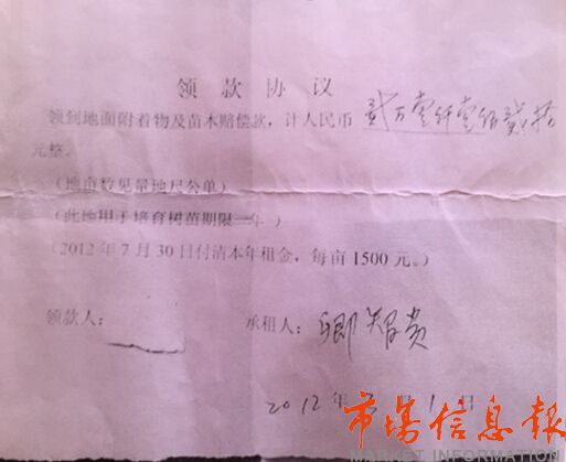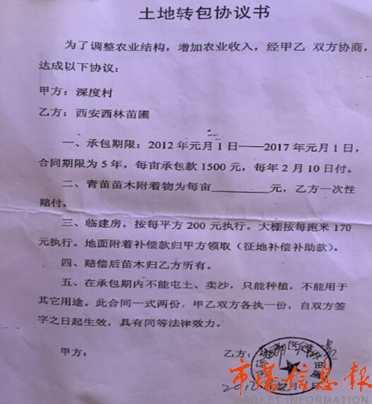 村民告訴記者,地鐵3號(hào)線征用他們村耕地一事施工前村民無人知情。2012年4月底,西林苗圃公司代表卿某在深渡村主任王某某帶領(lǐng)下,以每年1500元每畝地租了該村79畝耕地,租期5年?!暗乩镉蟹N樹的也有種麥子的,西林苗圃給我們每畝地上農(nóng)作物賠償價(jià)為一萬五到一萬六不等,當(dāng)時(shí)行情也就是一萬二左右吧,感覺賠償高我們就同意租了?!?/p>