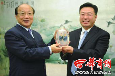 5月22日,榆林市委書(shū)記胡志強(qiáng)(右)在西安會(huì)見(jiàn)臺(tái)中市長(zhǎng)胡志強(qiáng)(左),并為其送上印有兩人頭像的工藝品
