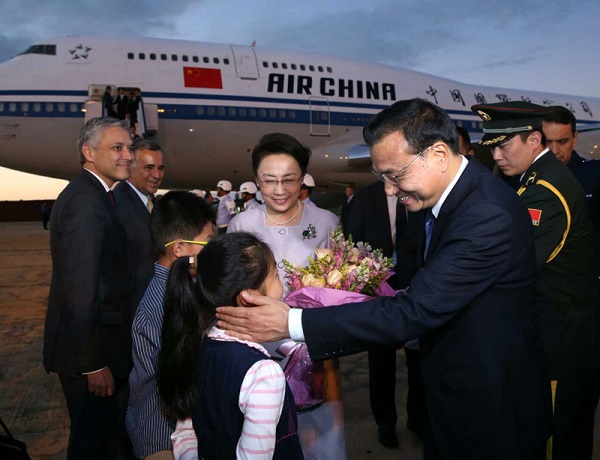 當(dāng)?shù)貢r間18日18時許,李克強(qiáng)走出專機(jī)艙門,踏上巴西首都巴西利亞的紅地毯,正式開始拉美四國首訪??偫韽谋本┏霭l(fā),經(jīng)停愛爾蘭,再到巴西利亞,總飛行時間已近22小時。未來三天,兩大金磚國家將再度握手,重點(diǎn)在產(chǎn)能和裝備制造等領(lǐng)域開展合作。