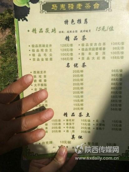 據(jù)吳先生介紹,當(dāng)日他和朋友2人來到馬嵬驛民俗村游玩,累了來到在廣場上的露天茶座納涼休息,剛坐下幾位服務(wù)員便遞過菜單稱“這里是有償休息區(qū),必須消費”。吳先生接過菜單預(yù)點一杯20元的茶卻遭到服務(wù)員拒絕,服務(wù)員稱,“必須按壺消費,否則不可以坐這里,這里是消費區(qū)?!眳窍壬豢床藛危粔貎r格最低59元。吳先生不解,“不是沒有最低消費嗎?”
