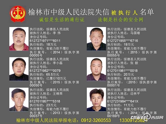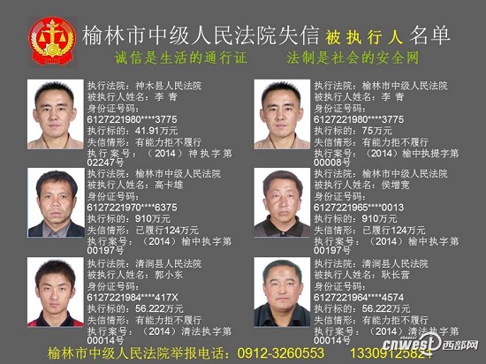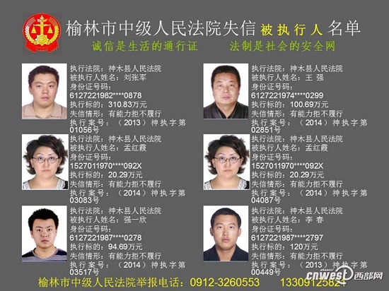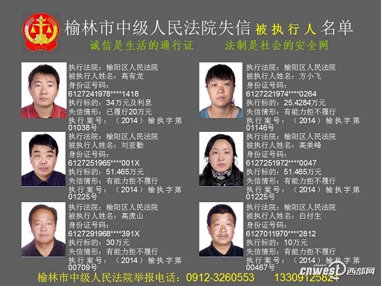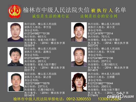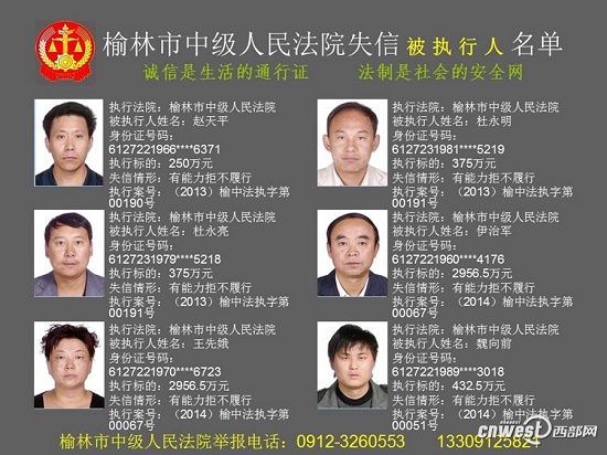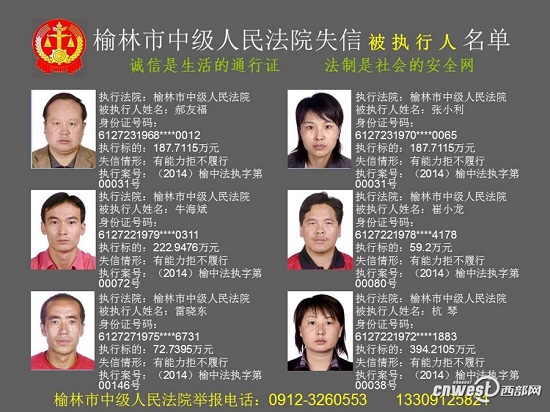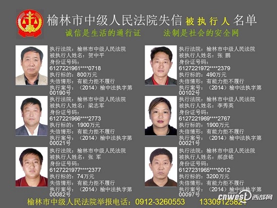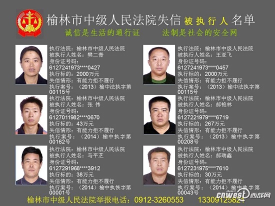 據(jù)了解,榆林為了加大對(duì)“老賴(lài)”的懲戒力度,維護(hù)當(dāng)事人的合法權(quán)益。從2014年10月以來(lái),榆林市中級(jí)人民法院先后兩次通過(guò)官方微博、微信公眾平臺(tái)和平面媒體發(fā)布了失信被執(zhí)行人信息。