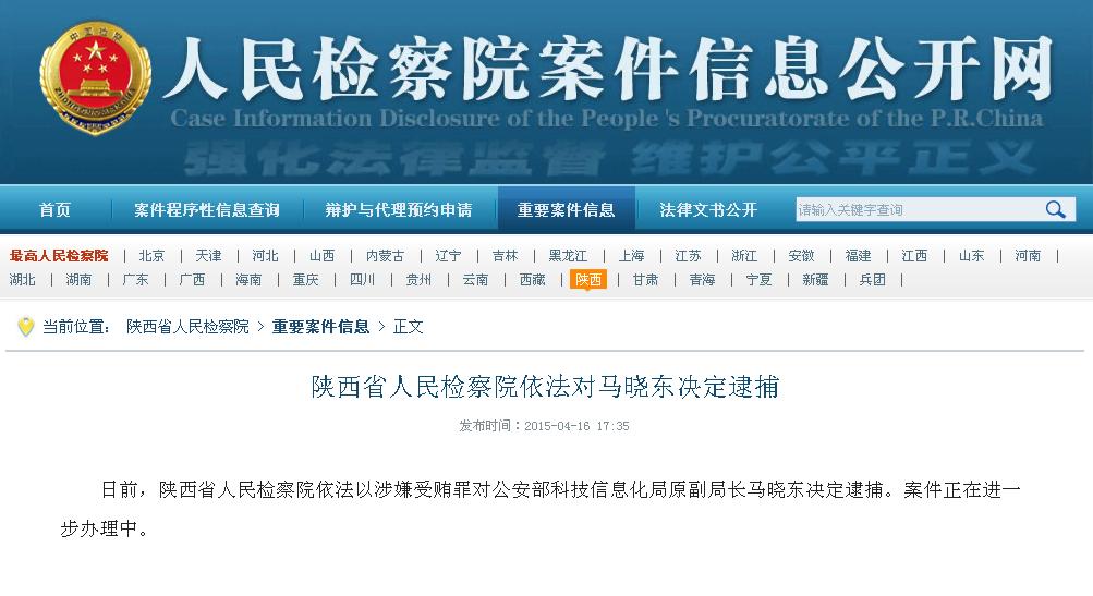 日前,陜西省人民檢察院依法以涉嫌受賄罪對(duì)公安部科技信息化局原副局長馬曉東決定逮捕。案件正在進(jìn)一步辦理中。