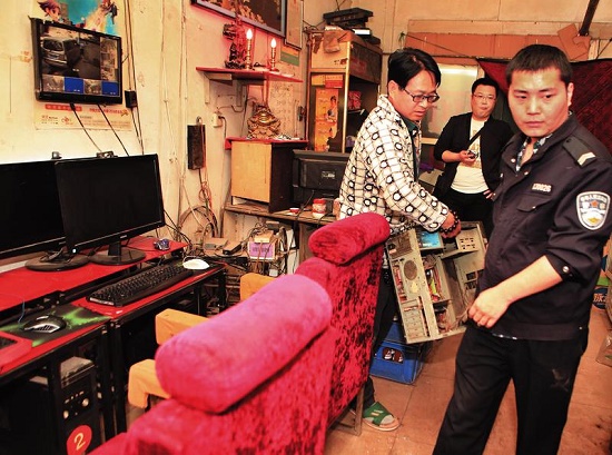 15時許,執(zhí)法民警將網(wǎng)吧內(nèi)的兩臺服務(wù)器和收費的電腦主機進行收繳。據(jù)民警介紹,按照規(guī)定,他們會將案件移交給工商部門,工商部門會對網(wǎng)吧進行處罰,一般情況下將處罰2000元。