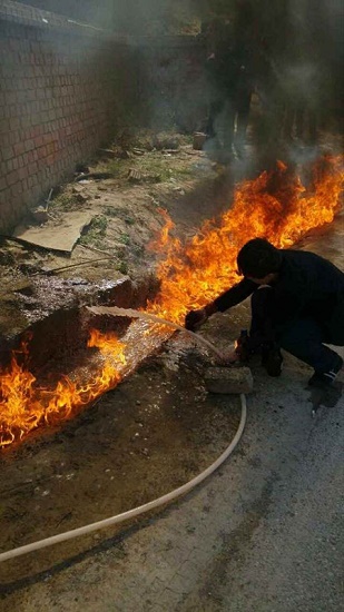 14日早上,安塞環(huán)保局相關(guān)負(fù)責(zé)人到拓家了解情況,“當(dāng)時(shí)我們用火點(diǎn)了下井水,一下就著起來(lái)了”,從拓志軍提供的現(xiàn)場(chǎng)照片上可以看到,水槽中的火焰有半個(gè)人高。