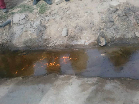 拓志軍打開(kāi)電泵,井水流了出來(lái)。華商報(bào)記者看到,水面上逐漸集起了一層油花,井水流了約二十分鐘后,村民用火柴點(diǎn)燃了一張紙后丟進(jìn)水里,水面逐漸燃燒了起來(lái),火苗順著流水方向燃燒過(guò)去。