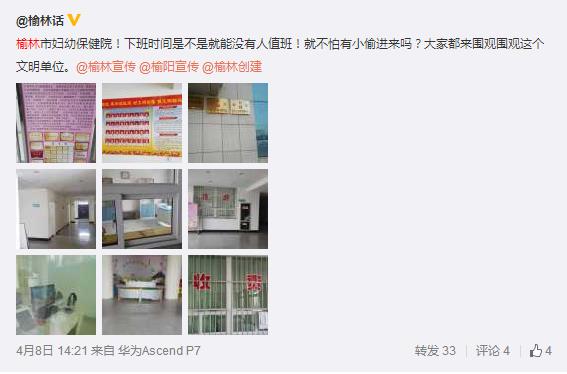 據(jù)新浪微博爆料:榆林市婦幼保健院!下班時間是不是就能沒有人值班!就不怕有小偷進來嗎?大家都來圍觀圍觀這個文明單位。