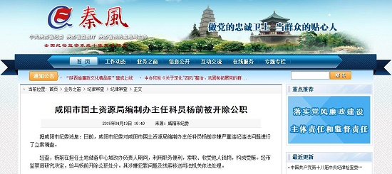 據(jù)咸陽市紀(jì)委消息:日前,咸陽市紀(jì)委對(duì)咸陽市國土資源局編制辦主任科員楊前涉嫌嚴(yán)重違紀(jì)違法問題進(jìn)行了立案調(diào)查。