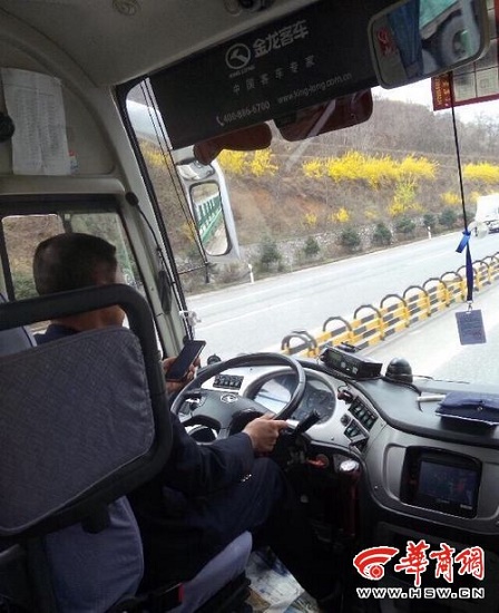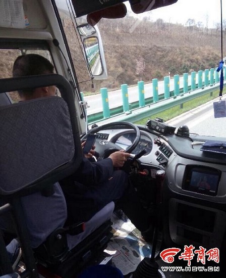 4月7日,網(wǎng)友“錦瑟瀟瀟王胤偉”微博爆料稱,“彬縣開往西安的客車司機(jī)拿整車生命不當(dāng)回事,邊開車邊耍手機(jī)?!蔽⒉┱掌@示,在高速路上行駛的客車上,一位身著藍(lán)色制服的中年男子,一手握著方向盤,一手拿著手機(jī),眼睛不時(shí)盯著手機(jī)屏幕。