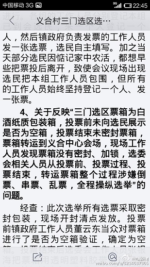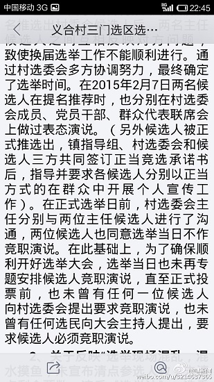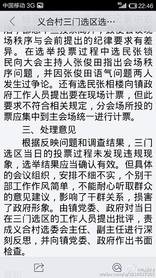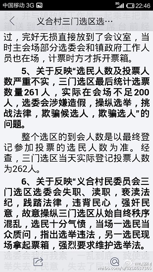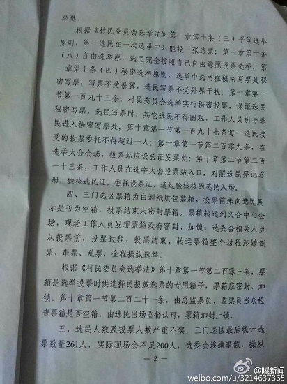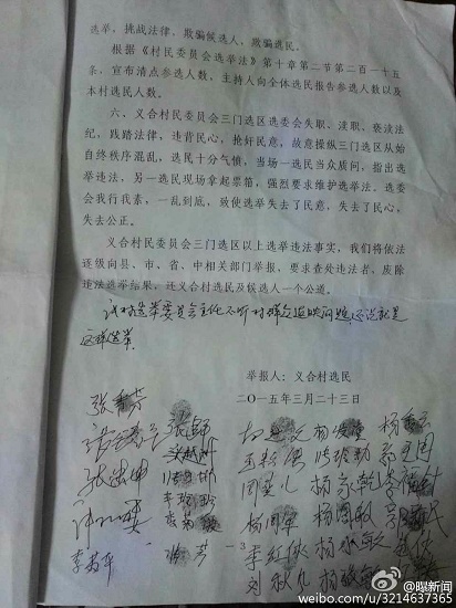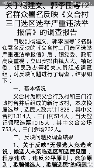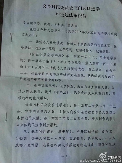 澄城縣安里鎮(zhèn)的義合村和三門兩村合并成義合村民委員會。3月22日分兩個選區(qū)進(jìn)行公開選舉村主任,會后,數(shù)十名群眾聯(lián)名向安里鎮(zhèn)政府及該縣有關(guān)部門舉報(bào)三門選區(qū)在選舉過程中程序嚴(yán)重違法,媒體人也接到同樣的舉報(bào),但安里鎮(zhèn)政府的調(diào)查結(jié)果卻令人生疑。