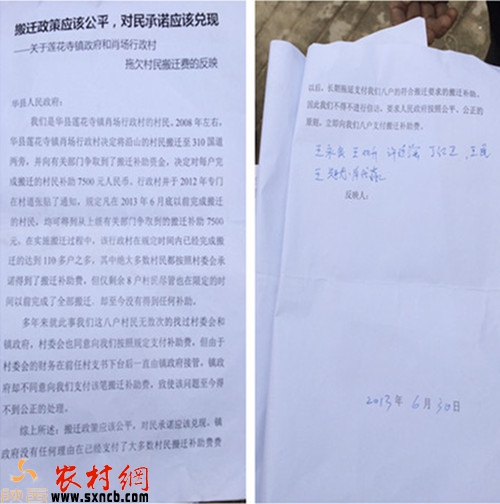 王彥長說:“我們村屬于2007年華縣經(jīng)濟發(fā)展局負責的以工代賑搬遷項目,當時要求群眾自己建房,我們這幾戶建的比較晚,我記得當時村道上貼著通知,截止在2013年6月30日前完成建房的都能得到搬遷補助,我們8戶就是剛好趕在6月30號前建好的,移民搬遷補助金都在鎮(zhèn)政府呢,就是不給我們?nèi)罕姲l(fā)放。這都到2015年了,我們的補助金還都沒領到。這是我們手里的反映材料,你可以看一下?!?