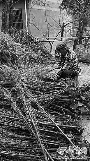 村民正在將枯死的側(cè)柏樹苗剁成柴