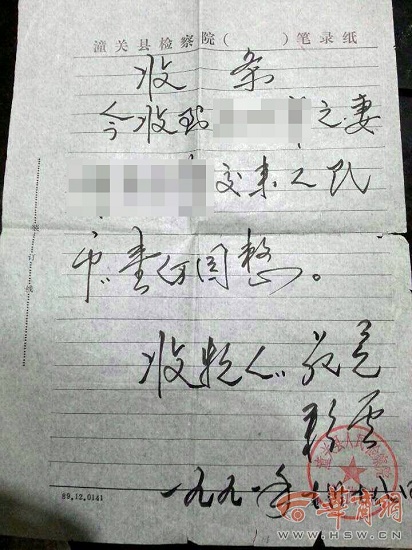 從師女士提供的給檢察院交錢的3張手寫的收據(jù)上看,收據(jù)上均寫著“今收到王某某之妻師某某交來的人民幣******元”字樣,落款有收款人簽名,收款人共涉及4人,其中兩張收據(jù)上蓋有“潼關(guān)縣人民檢察院自偵科”的公章,一張上有交款人和經(jīng)手人的簽名和手印。3張收據(jù)中,1張收據(jù)顯示收3萬元,其余兩張各顯示收1萬元,收款時(shí)間分別為:1991年9月16日,1991年9月18日,1991年10月5日。