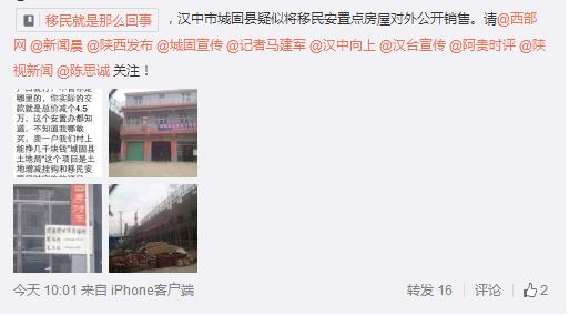 據(jù)新浪微博爆料:漢中市城固縣疑似將移民安置點(diǎn)房屋對(duì)外公開(kāi)銷售。