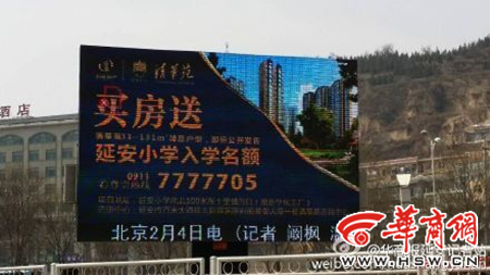 “買房送延安小學入學名額!”近日,這樣一則房產(chǎn)廣告出現(xiàn)在延安火車站廣場的戶外廣告屏幕上?!叭缃袢雽W名額這么寶貴,樓盤這么打廣告,明顯是用虛假廣告來欺詐消費者?!睂Υ?,校方回應稱,該樓盤是在虛假宣傳。